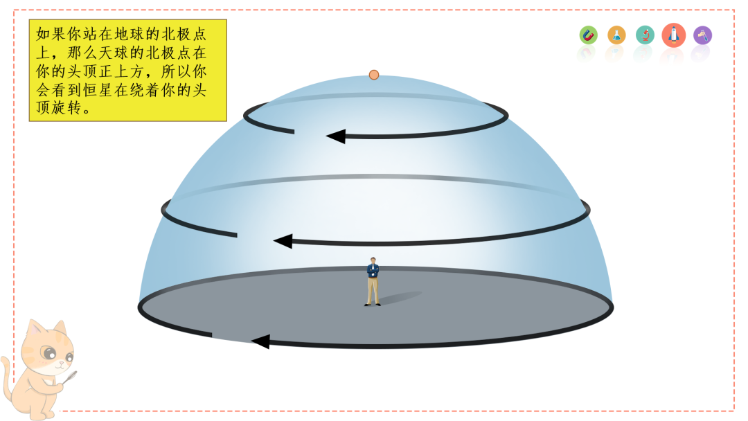1.如果你站在地球的北极点上,那么天球的北极点在你的头顶正上方,所以你会看到恒星在绕着你的头顶旋转。