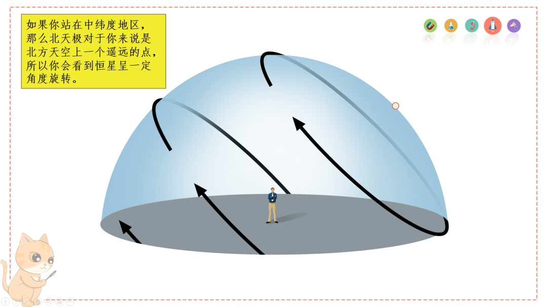 2.如果你站在中纬度地区,那么北天极对于你来说是北方天空上一个遥远的点,所以你会看到恒星呈一定角度旋转。