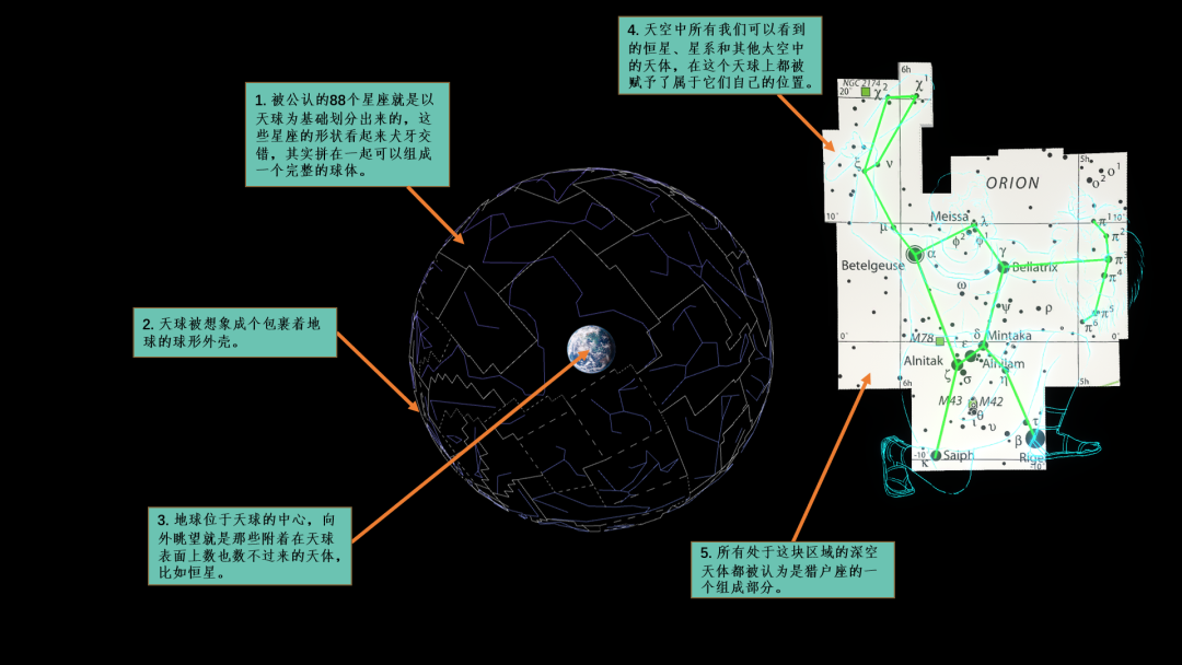4.天空中所有我们可以看到的恒星、星系和其他太空中的天体,在这个天球上都被赋予了属于它们自己的位置。