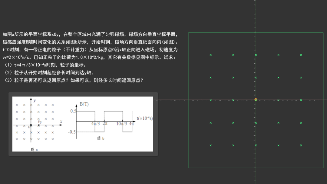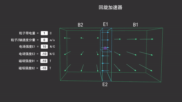 而对于带电粒子在复合场中运动的题目,想要弄明白它的物理过程还需要正确判断出粒子的运动轨迹,特别是对于周期性变化的电磁场更是如此。借助矩道虚拟仿真平台同样可以将物体的运动轨迹描绘出来,便于对物理过程的分析。