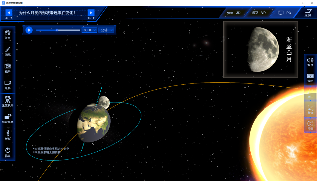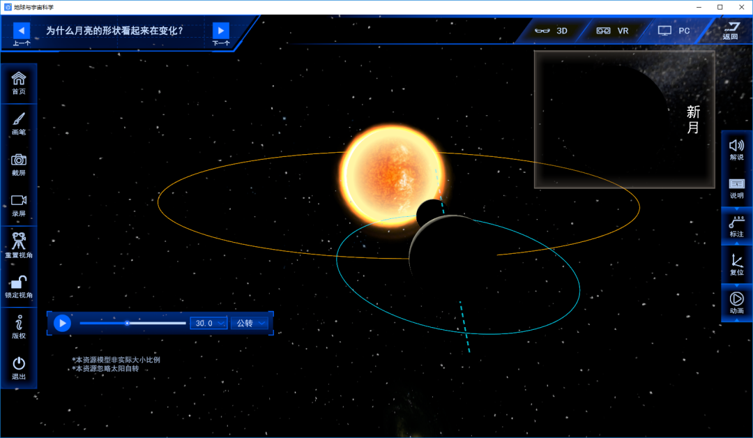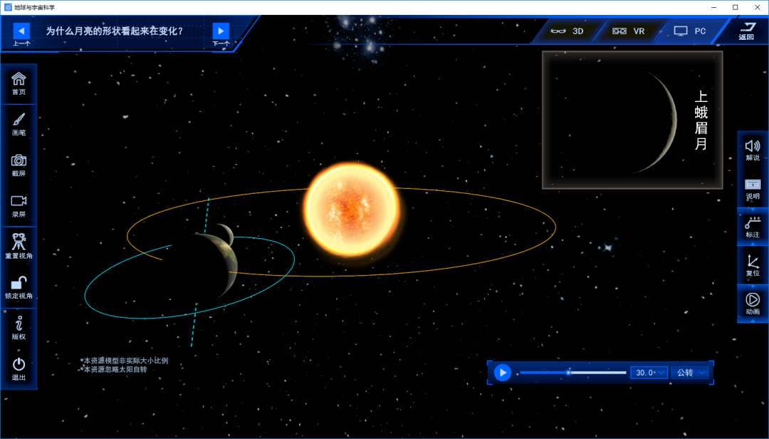 下面我们利用小学科学软件来还原一下月相变化的过程。同学们还可以利用虚拟现实技术来以上帝视角动态地来体验一下整个变化过程。