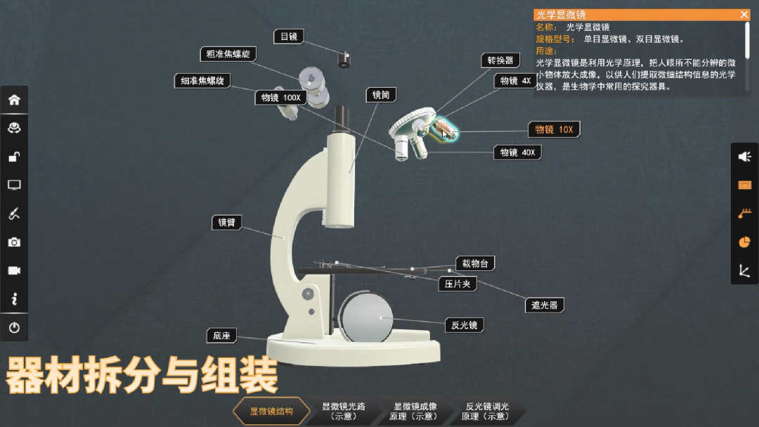 优化或重做器材模型,使组成、细节、拆解、材质等各方面更贴合实物。统一增加了语音讲解功能,对重点模型增加了使用动画演示功能,对可拆解模型增加了组装功能,同时也增添了电子分析天平等14种实验器材,使之能更好地服务于教学。