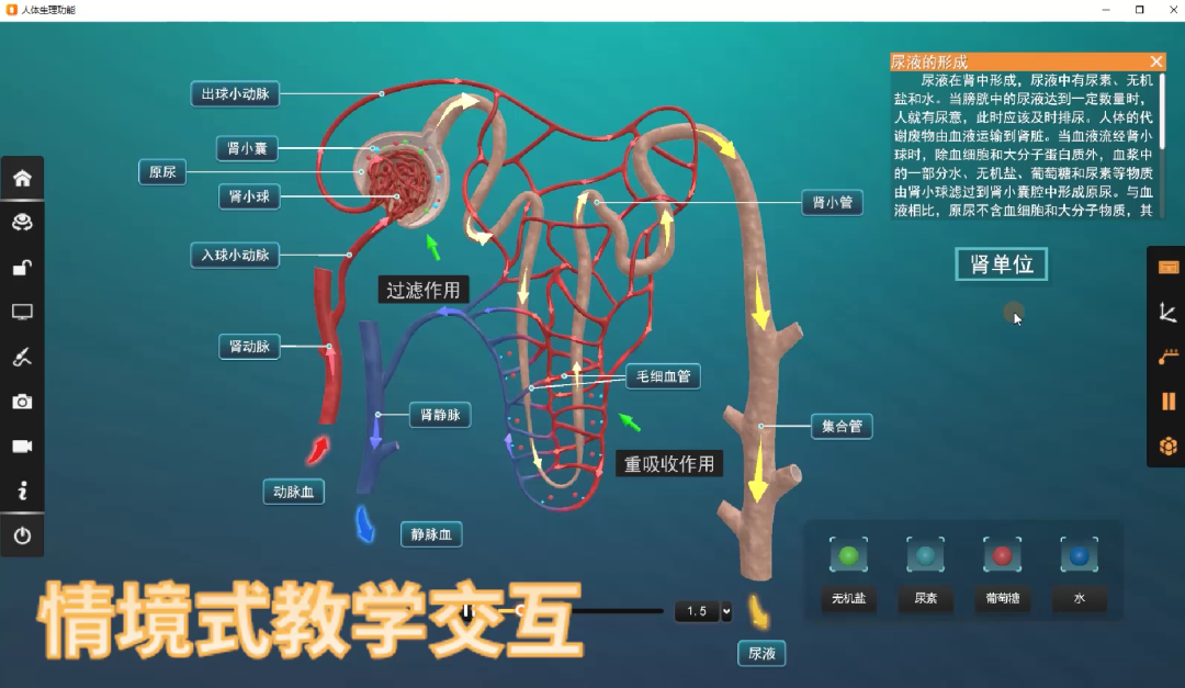 尿液的形成过程,增加人体动态生命活动场景中的UI交互。同步增设物质交换的3D图例。