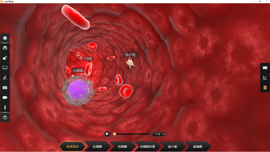 人体生理功能交互体验升级,增加VR 3D深度交互式操作。置身于血液流动的虚拟仿真场景中可以任意抓取流经身边不同种类的血细胞。